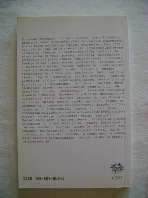 "Suvremeni francuski filozof i esejist Alain Finkielkraut, pripadnik novih francuskih filozofa stasalih sedamdesetih godina nakon razočaranja ishodom studentske pobune 1968. godine, zacijelo je jedan od najznačajnijih intelektualaca svojeg naraštaja. Njegova filozofsko-politička pozicija na paradoksalan je način pokušaj pomirenja univerzalizma i partikularizma nakon otkrića Kunderina eseja o tragediji Srednje Europe i malih naroda poslije 2. svjetskog rata i sovjetske invazije. Pokušaj nadilaženja tradicionalnih ideologijsko-političkih opreka ljevice i desnice Finkielkraut je i teorijski navijestio 1986. kad je u članku "Age de l´ideologie, age des cultures", nastojao promisliti razloge svjetsko-povijesnoga okreta pitanju kulturalnog i nacionalnog identiteta namjesto dotad vladajućeg kanona revolucionarnih utopija (...). Na praktičnoj razini, posredovanoj iskustvom strahotnih događaja u ratovima devedesetih godina na prostoru bivše Jugoslavije kad se otvoreno zauzimao za pravo Hrvata na nacionalnu državu protiv srpske agresije, njegov će angažman biti predmetom idolopoklonstva, žestoke kritike, zgražanja i ravnodušnosti. Premda su isti model filozofsko-političkoga angažmana francuskih intelektualaca njegova naraštaja devedesetih godina zastupali Bernard-Henri Lévy u zagovoru Bosne i Hercegovine i André Glucksman u obrani Čečenije na državnu samostalnost u ratnome sukobu s Rusijom, upravo će Finkielkraut biti prokazan kao kulturalni partikularist nacije, čak i kao državotvorni hrvatski filozof, a njegov će govor o sudbini malih nacija u postnacionalnoj Europi biti osuđen na prezir i nerazumijevanje."