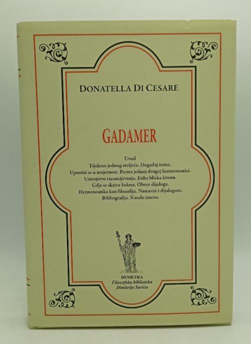 Donatella Di Cesare: Gadamer Autorica, redoviti profesor filozofije jezika na Filozofskom fakultetu u Rimu, u knjizi govori o životu i misaonim etapama H. G. Gadamera, od godina obrazovanja u rodnome mjestu do doba nacizma i rata u Leipzigu, od rođenja hermeneutike u Heidelbergu do njezine afirmacije u SAD-u i u svijetu. Istaknuta je važnost ne samo Gadamerova glavnog djela "Istina i metoda", već i prethodnih i kasnijih spisa te značaj koji je za hermeneutiku odigrala grčka filozofija. Bibliografija na kraju knjige sadrži popis djela u izvornom izdanju, talijanske prijevode, intervjue, zbirke posvećene Gadameru i kritičke studije.*(124) Stranica: 303Dimenzije: 17.5x24.5Jezik: ZagrebPismo: LatinicaStanje: OdličnoUvez: Tvrdi s ovitkomGodina: 2011