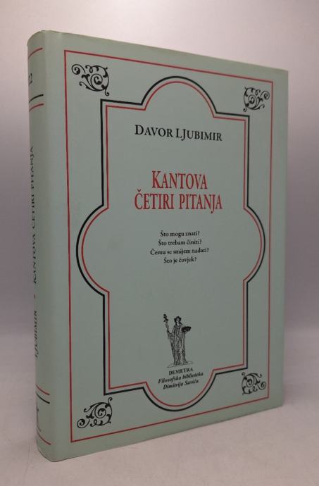 Davor Ljubimir: Kantova četiri pitanjaŠto mogu znati?Što trebam činiti?Čemu se smijem nadati?Što je čovjek? U knjizi se radi o pokušaju tumačenja cjeline Kantova filozofiranja na način da se izloži ono što leži u pozadini njegovih djela namijenjenih javnosti, nadasve triju kritika, iz horizonta njegovih ezoteričnih antropoloških uvida te manjih, naoko nevažnih radova. Sadržajno se rad fokusira na Kantova čuvena četiri pitanja, a sukladno njegovu naputku primarno na ono četvrto, „Što je čovjek?“, u koje se, kako kaže, mogu „uračunati“ sva ostala. Sustavnim izvođenjem tog „uračunavanja“ pitanja o spoznaji, o djelovanju i o nadanju u pitanje o čovjeku nastoji se ponuditi odgovor na pitanje o tome zašto je izuzetno kompleksnim i preciznim mišljenjem ustrojena „zgrada“ Kantove misli upravo takva kakva jest, a ne drukčija, te kako su njezine sastavnice uzajamno povezane. Rezultat takvih nastojanja jest prikaz Kantova filozofiranja kao strahom prožete tegobne borbe sa stanjima koja ugrožavaju čovjekovu životnost i vode k usmrćenju života: s bitnom dezorijentiranošću, s indiferentnošću, s beznadnom dosadom. (122) Stranica: 365Dimenzije: 18x25Jezik: ZagrebPismo: LatinicaStanje: OdličnoUvez: Tvrdi s ovitkomGodina: 2010