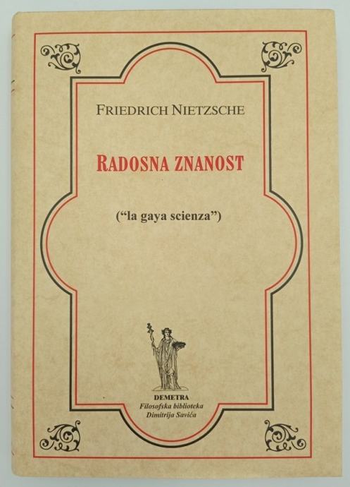 Friedrich Nietzsche: Radosna znanostZbirka aforističkih zapisa koja predstavlja krunu druge faze misaonoga puta ovog filozofa. On kao filozof suprotstavlja sebi i znanost i umjetnost, ali ujedno odbacuje prošlost filozofije i njezin jezik, te o filozofijskim sadržajima više ne govori zastarjelim pojmovima, nego na nov način, time što onome što je preživjelo, naime znanosti i umjetnosti, uzima njihove instrumente, te ih primjenjuje kao filozof. I ovdje se ističu teme vezane uz kritiku morala i kulture Nietzscheova doba, a osobito je naglašeno tematiziranje duhovnoga zdravlja kao izraza sklada tijela i duha, te životne snage. Jedna od središnjih misli ovoga djela, kao i autorova opusa u cijelosti, možda je ponajbolje izražena njegovim vlastitim riječima napisanima u predgovoru: "Živjeti - to za nas znači sve što jesmo stalno pretvarati u svjetlost i plamen, a također i sve što nas pogađa, mi i ne možemo drukčije." 72Stranica: 262Dimenzije: 17.5x24.5Jezik: ZagrebPismo: LatinicaStanje: OdličnoUvez: Tvrdi s ovitkomGodina: 2003