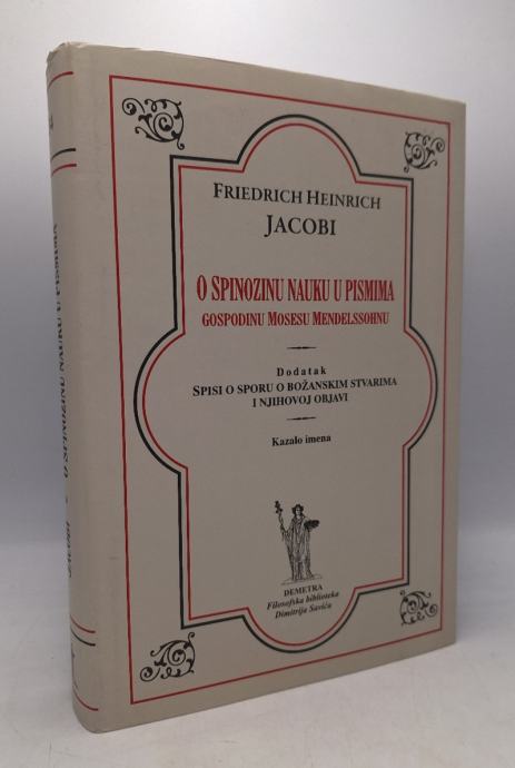 Heinrich Jacobi Friedrich: O Spinozinu nauku u pismima gospodinu Mosesu MendelssohnuDodatakSpisi o sporu o božanskim stvarima i njihovoj objavi Studijsko izdanje koje sadrži prvo izdanje pisama iz 1785., te proširenja drugog (1789.) i proširenja trećeg izdanja (1819.), uz dodatak "Spisa o sporu o božanskim stvarima i njihovoj objavi" (1811.) predstavlja doprinos povijesti filozofskih sporenja, jer donosi kritički dijalog sa Spinozinom filozofijom, gdje je predmet spor o panteizmu, koji se proširio na raspravu oko racionalizma kao takvog. Jacobijev stav prema Spinozinoj "Etici" priređivačica njemačkog izdanja iz 2000., Marion Lauschke, ocjenjuje kao stav fascinirana ali ogorčena protivnika, jer se i sam Jacobi opisuje kao "jedini legitimni spinozist koji je antispinozist".*(134) Stranica: 382Dimenzije: 18x25Jezik: ZagrebPismo: LatinicaStanje: OdličnoUvez: Tvrdi s ovitkomGodina: 2013
