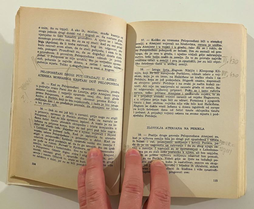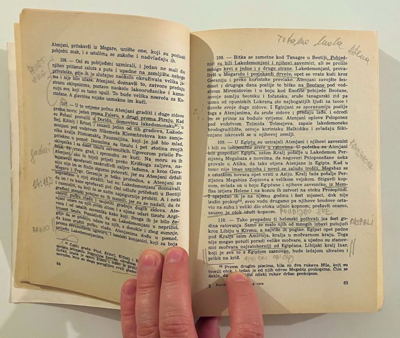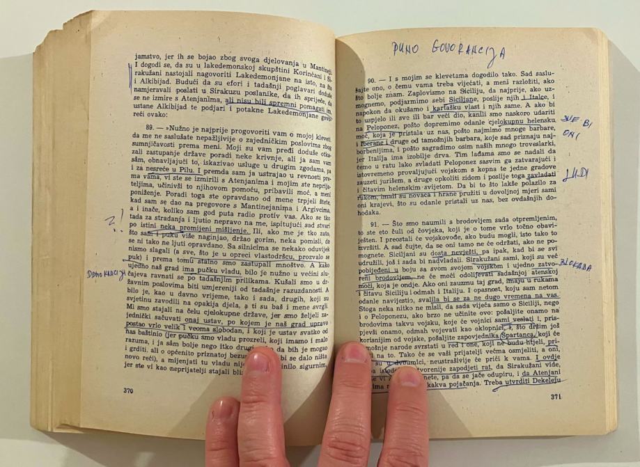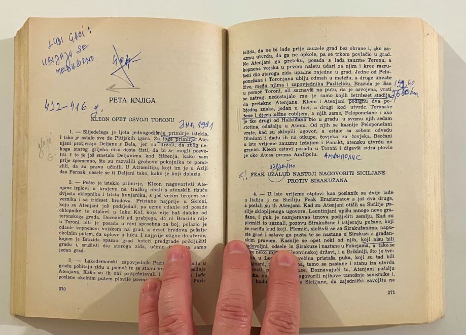 Držeći se vlastita metodološkog, tzv. pragmatičkog načela točnog, objektivnog i istinitog opisivanja povijesnih događaja, atenski povjesničar Tukidid napisao je Povijest Peloponeskog rata, historiografsko remek-djelo, uz Herodotovu Povijest najcjenjeniji i nacitiraniji izvor za starovjekovnu grčku povijest. To arhetipsko djelo historijske kritike u osam knjiga opisuje rat između Atenjana i Spartanaca u dvadesetogodišnjem razdoblju (od 431. do 411. pr. Kr.), objašnjavajući povijesna zbivanja kao rezultat ljudskih postupaka, političkih interesa i uzročno-posljedičnih veza među događajima, u potpunosti zanemarujući tada popularna mitološka ili mistička tumačenja prošlih događaja. Premda teško razumljive sintakse, Tukididovo djelo u brojnim dramatski ustrojenim dijelovima (kuga u Ateni, sicilska ekspedicija, Periklov govor...) pokazuje iznimne književne vrijednosti karakteristične za kanonska djela starogrčke tragedije.