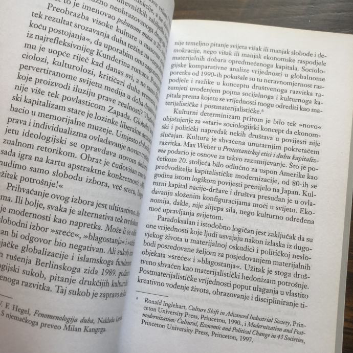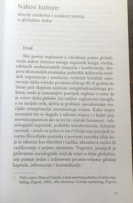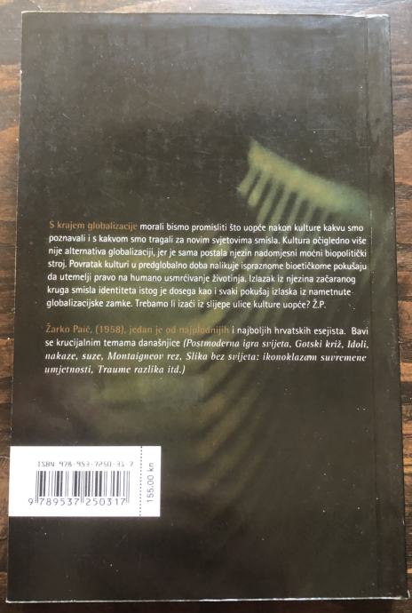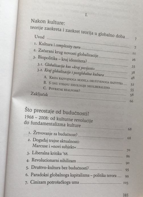 S krajem globalizacije morali bismo promisliti što uopće nakon kulture kakvu smo poznavali i s kakvom smo tragali za novim svjetovima smisla. Kultura očigledno više nije alternativa globalizaciji, jer je sama postala njezin nadomjesni moćni biopolitički stroj. Povratak kulturi u predglobalno doba nalikuje ispraznome bioetičkome pokušaju da utemelji pravo na humano usmrćivanje životinja. Izlazak iz njezina začaranog kruga smisla identiteta istog je dosega kao i svaki pokušaj izlaska iz nametnute globalizacijske zamke. Trebamo li izaći iz slijepe ulice kulture uopće?