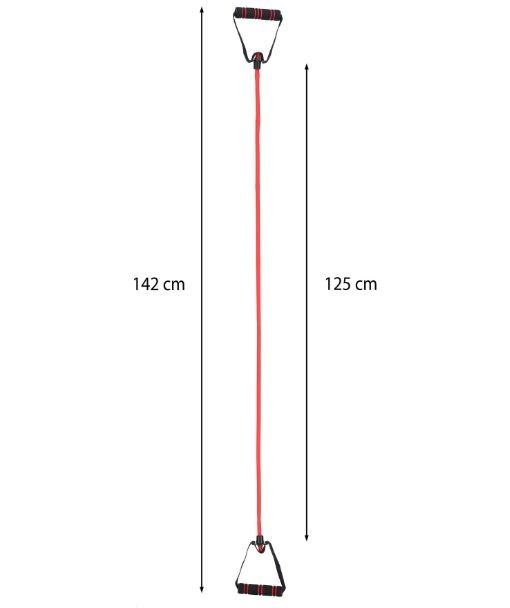 Gumena elastika s ručkama za jačanje mišića gornjeg dijela tijela. Može se koristiti za rehabilitacijske vježbe.Ukupna dužina: 142 cmDuljina elastike: 125 cm