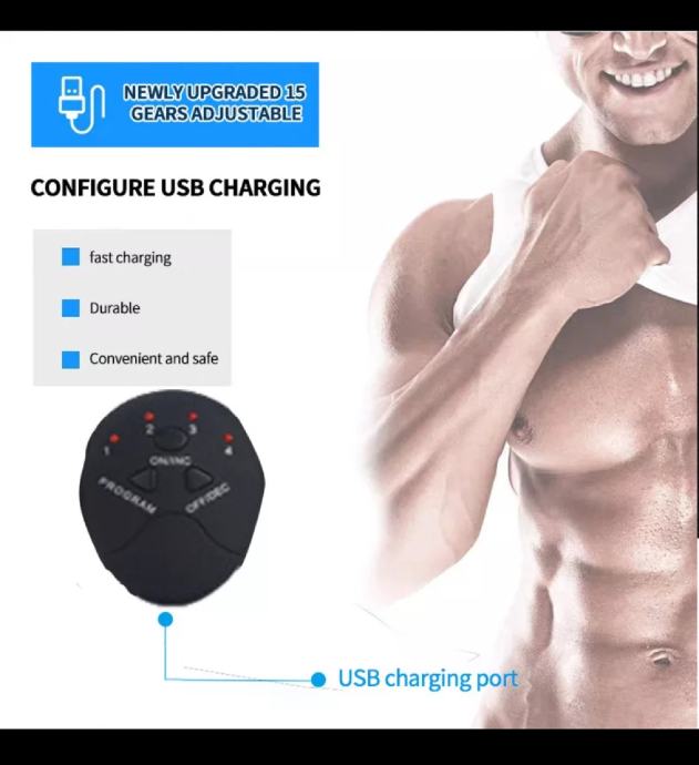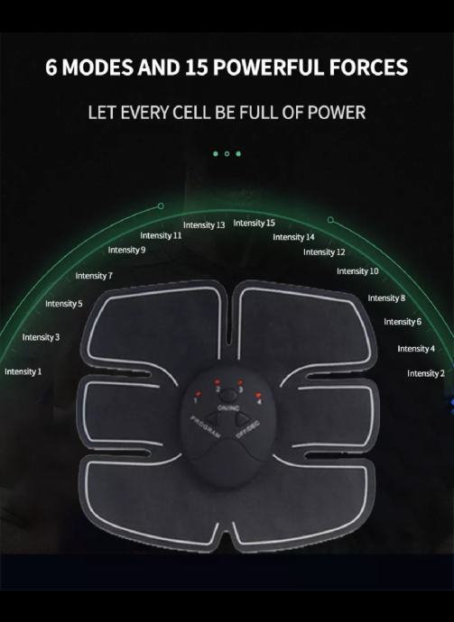 Inovativna, bežična tehnologija/wireless, USB punjenje /fast charging/brzo punjenje, 6 modova rada, 15 stupnjeva snage, procijenjena učinkovitost za samo 20 minuta dnevno aplikacije na prednji trbušni zid!