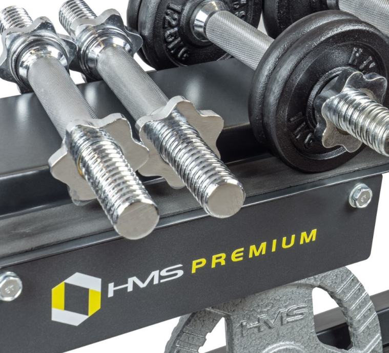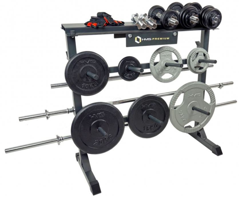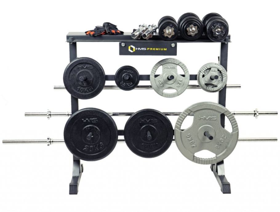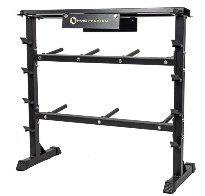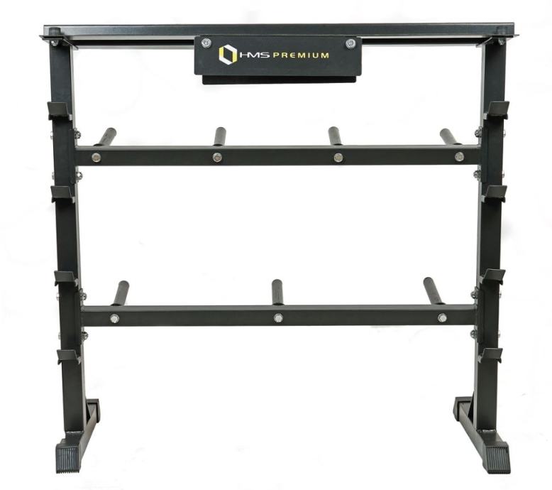 Snažno HMS Premium čelično postolje pogodno za odlaganje opreme za fitness u kući.4 držača za šipke7 držača diskova, duljine 21 cm, promjera 25 mmGornja polica za ostalu fitness opremuŠirina: 100 cmVisina: 95 cmDopušteno opterećenje: 250 kgTežina: 17 kg