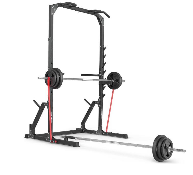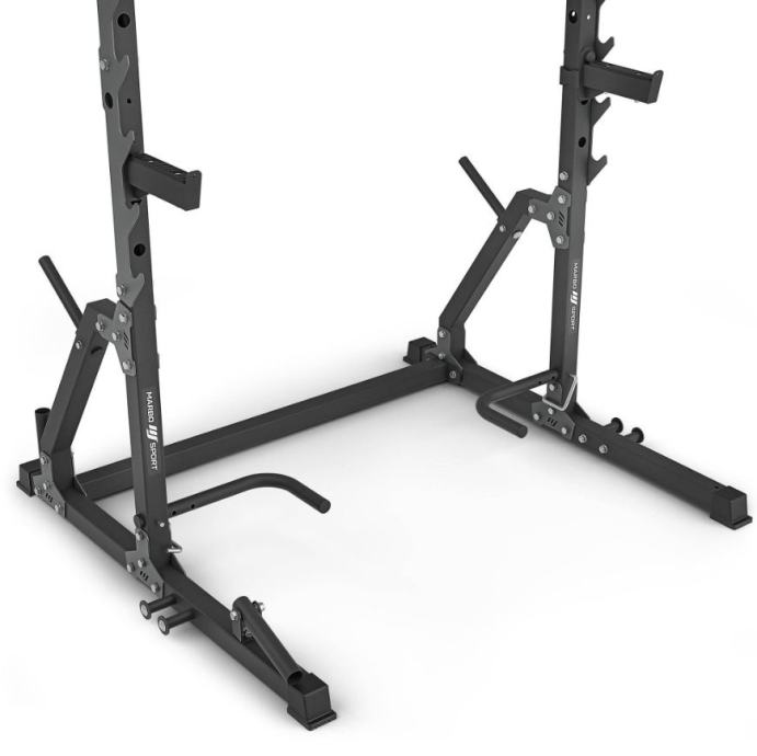 Half rack kavez MS-U115 2.0 MARBO stabilna je fitness sprava koja omogućuje izvođenje širokog spektra vježbi za gornje i donje mišićne skupine.Mogućnosti korištenja:Vježbe sa šipkom - i na klupi i u stojećem položaju.Vježbe s vlastitom tjelesnom težinom, npr. sklekovi, zgibovi, čučnjeviTrening boksa.Ostale vježbe u kavezuPrednosti:7 različitih visina za spuštanje šipke tijekom treninga2 dodatna sigurnosna držača koji se mogu podesiti u 4 visine. Produžetak Landmine za šipke širine 30 mm.Vježba zgibova na gornjim držačima koji nude mogućnost različitih hvatova!Kuka za boksačku vrećuNosači za diskove i nosači za šipkeRučke za trening sklekova koje se mogu podesiti na 2 visine i 3 različite širineGumene noge za zaštitu podaMogućnost pričvršćivanja sprave za tlo čime se poboljšava njena stabilnost i povećava sigurnost tijekom treninga. Metoda sidrenja mora se odabrati pojedinačno, uzimajući u obzir vrstu podloge i način uporabe proizvoda.Duljina: 119 cmŠirina: 123 cmVisina: 211 cmDodatni držači: min: 75 cmTežina: 46 kgMaksimalna nosivost: 250 kgProfil: 50 x 50 x 2 mm