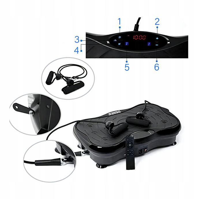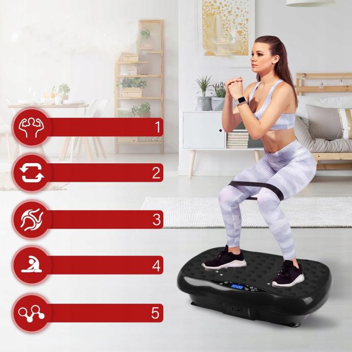 Ugrađeni LCD zaslon olakšava praćenje vježbanja, a višestruke brzine vibracije omogućuju vam da prilagodite intenzitet vježbanja svojim potrebama. Priložene trake za vježbanje omogućuju dodatne vježbe za gornji dio tijela za poboljšanje ukupne kondicije.