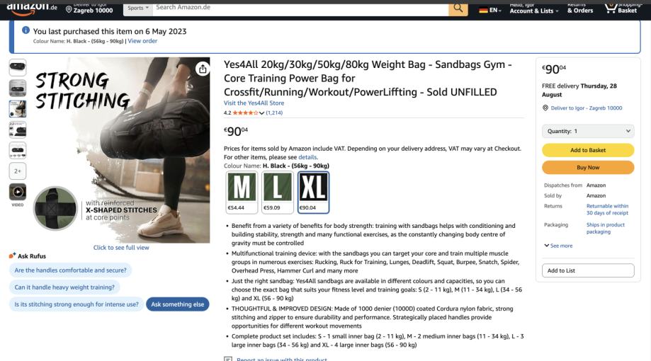 Yes4All XL torba za vježbanje (pješčana torba) – nova, Amazon, 80 €