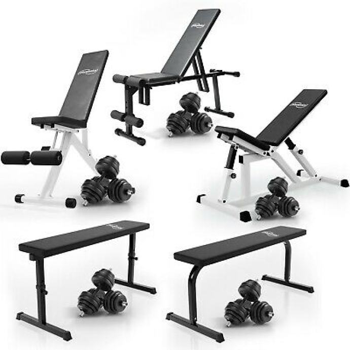 Hantelbank 1:Gesamtmaße der Bank (L/B/H): ca. 133 / 41 / 50-125 cmSitzfläche (L/B): ca. 30 / 30 cmRückenlehne (L/B): ca. 24 / 79 cmDicke der Polsterung: ca. 4,5 cmGewicht: ca. 12,52 kg Maximale Belastung: ca. 200 kg (Gewicht des Benutzers und Gewichte)Maximale Körpergröße des Benutzers: ca. 2 mMaterial:StahlrahmenRückenlehne und Sitz:KunstlederpolsterungSchaumstoffpolsterungFußkappen aus KunststoffFarbe: weiß (Gestell); schwarz (Polsterung)Hantelbank 2:Abmessungen (L/B/H): ca. 115 x 32 x 45-113 cmSitz (L/B): ca. 29,5 x 24 cmLehne (L/B): ca. 72 x 24 cmDicke der Polsterung: ca. 4,5 cmGewicht: ca. 15,2 kgMax. Gesamtbelastung: ca. 200 kg (Benutzergewicht und Gewichte)Max. Gewicht des Benutzers: bis ca. 100 kgMax. Gewicht der Hantel: bis ca. 100 kgMax. Körpergröße des Benutzers: ca. 2,1 mMaterial:StahlrahmenRückenlehne und SitzKunstleder, SchaumstoffpolsterungFußkappen aus KunststoffFarbe: schwarzHantelbank 3:Abmessungen (L/B): ca. 120 x 53 cmVerstellbarer Sitz: ca. 47-66 cm (4-stufig)Verstellbare Rückenlehne: ca. 47-113 cm (7-stufig)Sitzfläche (L/B): 35 x 24 cmRückenlehne (L/B/H): ca. 72,5 x 24 x 4,5 cmGewicht: ca. 14,24 kgMax. Gesamtbelastbarkeit: ca. 200 kg (Benutzer und Gewichte)Max. Körpergewicht: ca. 100 kgMax. Körpergröße des Benutzers: ca. 2,1 mMaterial:Rückenlehne und Sitz:KunstlederpolsterungSchaumstoffpolsterungFußkappen aus KunststoffFarbe: weiß, schwarzHantelbank 4:Abmessungen (L/B/H): ca. 110/47/44-57 cmHöhe (verstellbar): ca. 44 / 47 / 50 / 53 / 57 cmSitzfläche (L/B): ca. 110 x 24 cmPolsterung: 4,5 cmGewicht: ca. 7,52 kgMax. Körpergewicht mit Gewichten: ca. 200 kg (Benutzer und Gewichte)Max. Körpergröße des Benutzers: ca. 2,1 mMaterial:Rahmen: StahlRückenlehne und Sitz:KunstlederpolsterungSchaumstoffpolsterungFußkappen: KunststoffFarbe: schwarzHantelbank 5:Abmessungen (L/B/H): ca. 115/51/48 cmSitzfläche (L/B): ca. 115/26 cmPolsterung: 4,5 cmGewicht: 7,6 kgMax. Gesamtbelastung: ca. 200 kg (inkl. Gewichten und Körpergewicht)Max. Körpergewicht: ca. 100 kgMax. Körpergröße des Benutzers: ca. 2,1 mMaterial:Rahmen: StahlRückenlehne: mit Kunstleder gepolstertPolsterung: SchaumstoffFußkappen: KunststoffFarbe: schwarz