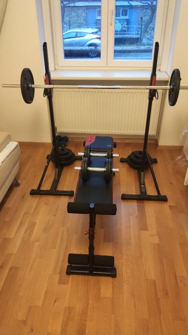 Prodaje se kompletni set bench, rack, sipka i utezi, Decathlon (Domyos brand), dolazi sa ukupno 80 kg utega (4x10 kg, 4x5 kg, 8x2 kg, 4x1 kg), sipka i utezi su 28mm standard, sipka ima oko 10-11 kg. Dolazi i sa dvije krace sipke za bucice, koje koriste isti standard i primaju iste utege. Klupa se moze namjestiti i u kosi položaj.
