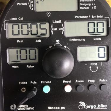 Anzeigen: 5 x Flüssigkristall, für Puls, Entfernung, Geschwindigkeit, Durchschnittsgeschwindigkeit, Leistung in Watt, verbrauchte Kalorien, Pedalumdrehungen ( RPM ), Trainingszeit.