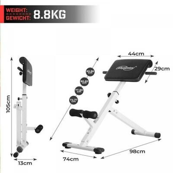 45° einstellbarer WinkelMaße (L/B/H): ca. 98 x 74 x 75-86 cmMaße zusammengeklappt (L/B/H): ca. 74 x 13 x 105 cmLendenkissen Maße (L/B/H): ca. 44 x 29 x 7 cmLendenkissen vierfach höhenverstellbar:74 - 77 cm77 - 80 cm80 - 83 cm83 - 86 cmGewicht: ca. 8,8 kgGeeignet für Körpergrößen zwischen 160 und 190 cmMaximal zulässiges Gewicht: 120 kgMaterial: Stahl, Kunststoff, Polywood, Schaumstoff, PVCFarbe: schwarz und weiß