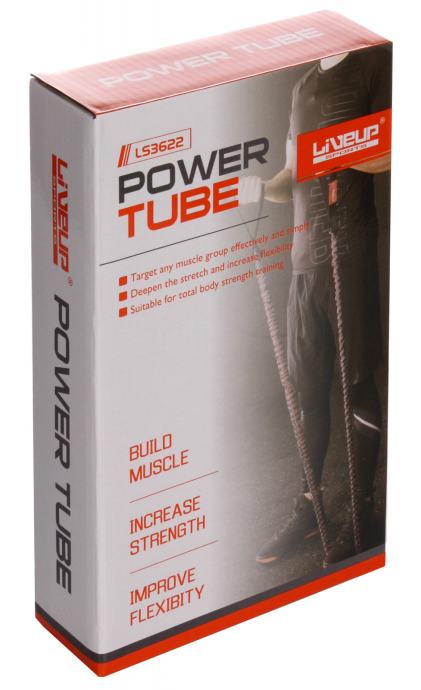 Toning Tube LS3622 guma za vježbanje praktičan je alat za vježbanje i zahtijeva malo prostora. Izrađena je od kvalitetnog lateksa visoke elastičnosti i ima rukohvate na oba kraja. Guma je duljine 120 cm i može se rastegnuti do 320 cm. Guma preko sebe ima zaštitni rukav.