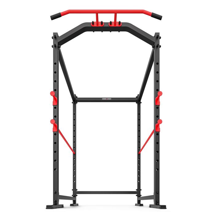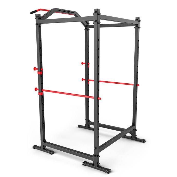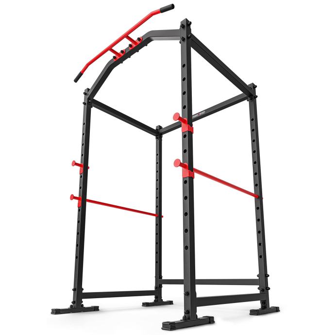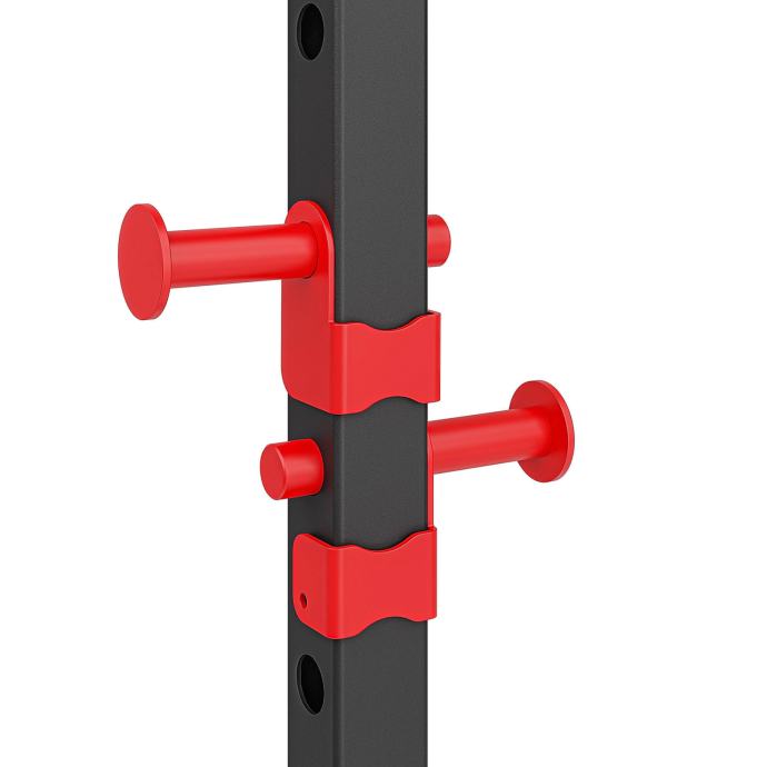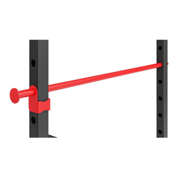 Set uključuje dvije otporne kuke koje se mogu lako i brzo umetnuti u rupe. Visina polica može se postaviti u 13 različitih položaja. Power Rack također ima šipku za izvlačenje širine 120 cm i udobne, gumirane ručke. Kavez sadrži šipku za izvođenje zgibova u tri različite širine prianjanja. Izvana se nalaze udobne, gumirane ručke koje jamče siguran trening. Power Rack sadrži dvije kuke za pohranu na koje možete jednostavno i sigurno postaviti uteg tijekom čučnjeva, treninga ramena ili treninga na bench klupi. Kuke se mogu umetnuti svakih 10 cm u 13 različitih visina, od 43 do 163 cm, a mogu se pričvrstiti iznutra ili izvana kaveza.