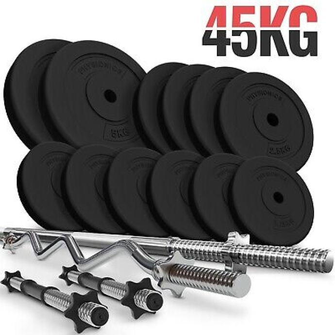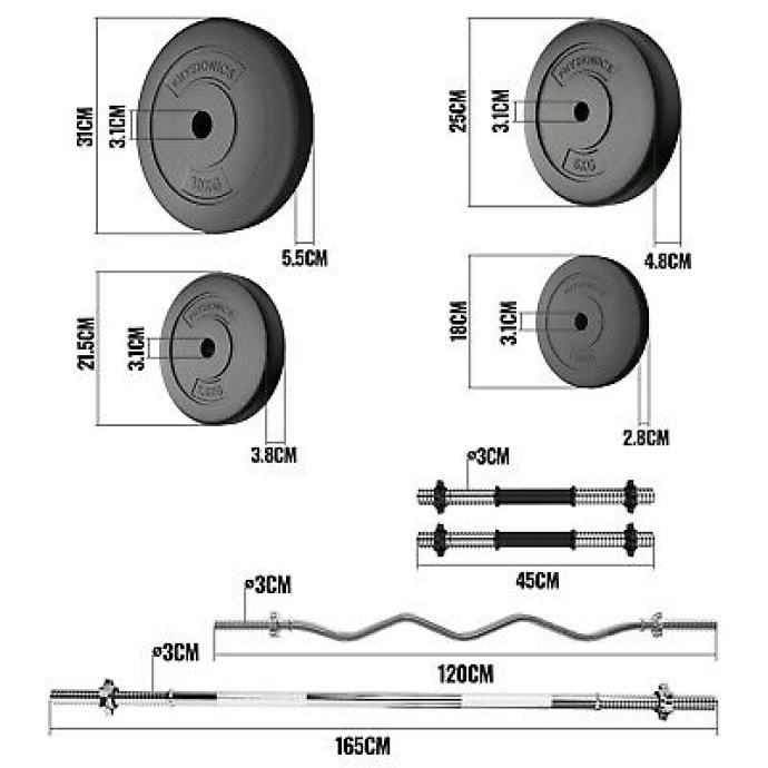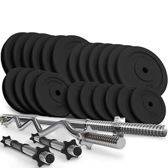 Trening kod kuće omogućuje vam fleksibilan trening u bilo koje vrijeme. S ovim kompletom koji se sastoji od šipke s utegom, SZ šipke, dvije šipke s utezima i ploča s utezima ukupne mase, možete trenirati prema vlastitim zamislima. Promjer otvora diskova je 31 milimetar, a plastični premaz diskova štiti pod i smanjuje zveckanje.