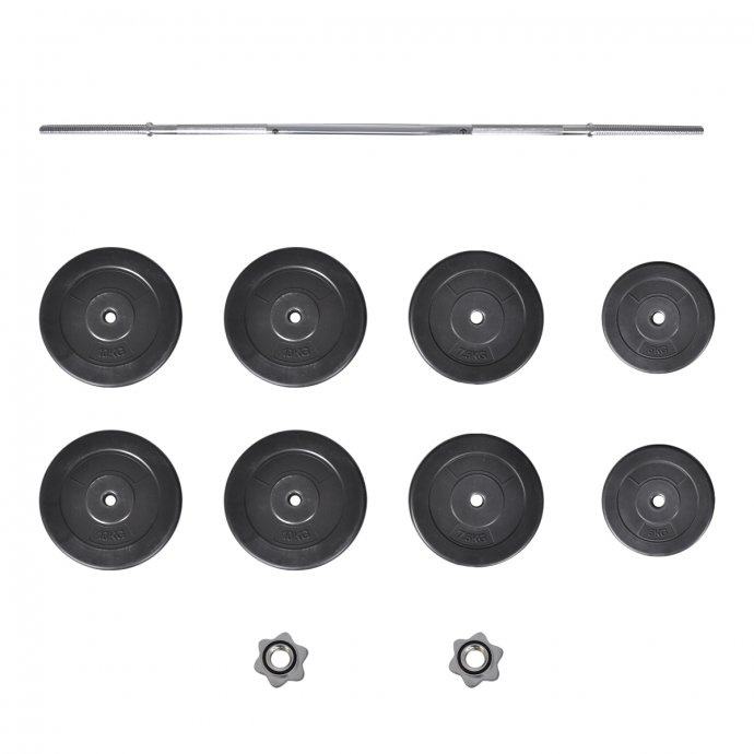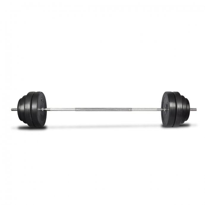 Matice u obliku zvijezda, osiguravaju da utezi ostanu na mjestu. Ručke ove šipke imaju posebnu strukturu za optimalno prianjanje tijekom vježbanja. Utezi su betonski i imaju plastičnu oblogu koja smanjuje buku tijekom vježbanja.