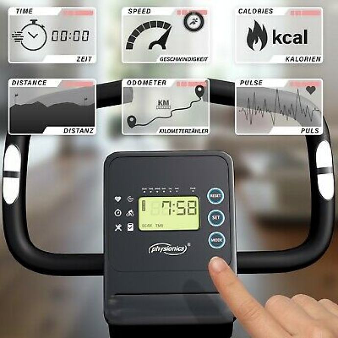 Zaslon računala radi na baterije i ima funkcije vremena, brzine, udaljenosti, otkucaja srca, kalorija i brojača kilometara
