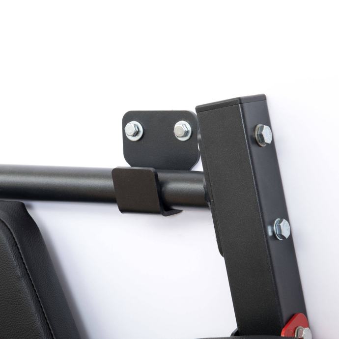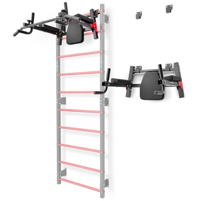 Zidno vratilo sa šipkom za zgibove, chin dip vratilom i nosačem za vreću Marbo MH-U205 nudi vam mnoge mogućnosti za profesionalni trening mišića leđa i ramena. Set je opremljen s dva tapecirana naslona za ruke i velikim naslonom za leđa. Ručke na naslonima za ruke možete prilagoditi svojim potrebama zahvaljujući odgovarajućem podešavanju gumba za pritisak. Možete ih postaviti na dvije udaljenosti od zida – 43 cm i 47 cm.