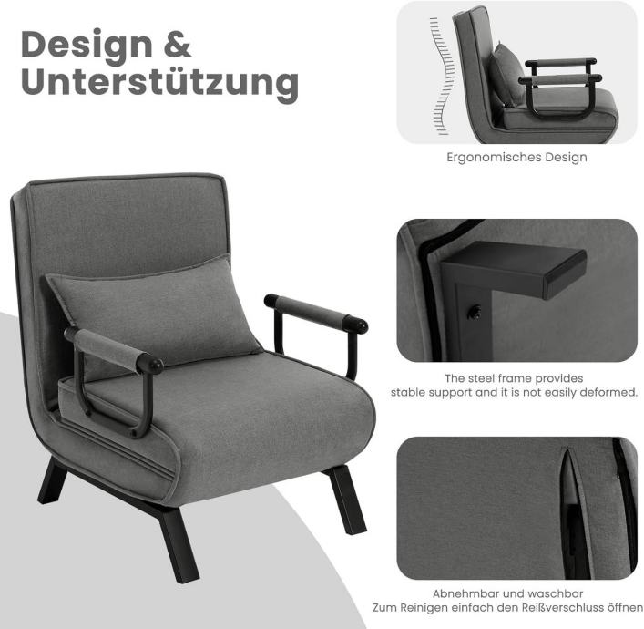 3-u-1 multifunkcionalni stolac: Zahvaljujući sklopivom dizajnu, stolac se može pretvoriti u fotelju, ležaljku ili jednostruki ležaj prema potrebi. Idealan je za male prostore jer stvara dodatno mjesto za odmor i štedi prostor.