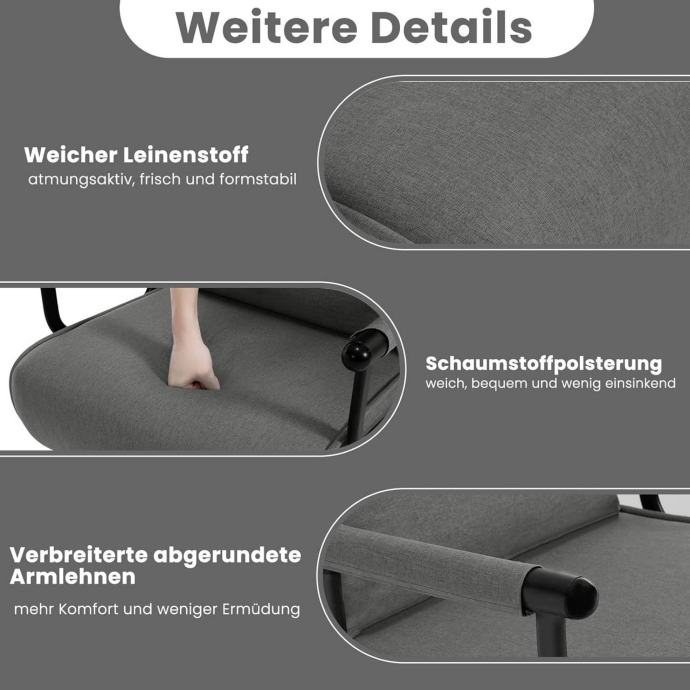 Udoban sjedalo i jastuk: Sjedalo i uklonjivi jastuk ispunjeni su visokoleastičnom pjenom koja osigurava ugodno sjedenje i spavanje. Lanena navlaka je prozračna, mekana i uklonjiva radi lakšeg čišćenja. Visok naslon pruža dovoljnu potporu tijelu. Jastuk se može koristiti kao lumbalna potpora pri sjedenju ili kao jastuk za glavu pri ležanju.
