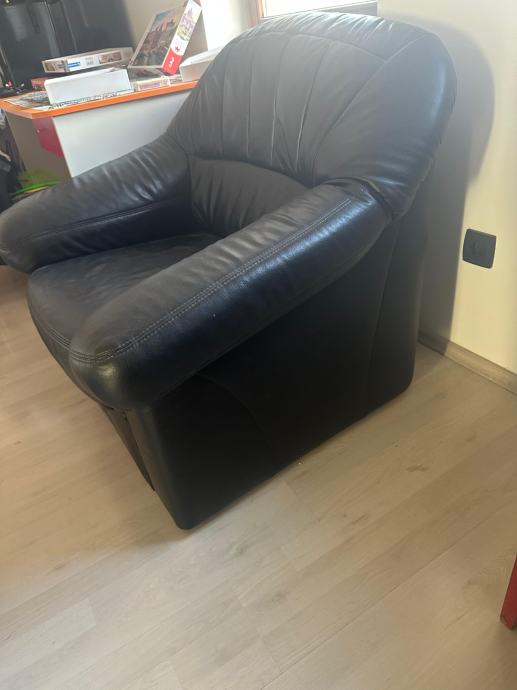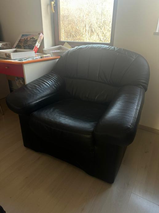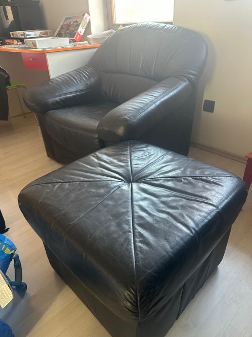 Prodajem izuzetno udobnu kožnu fotelju s pripadajućim tabureom. Fotelja je masivna, 'oversized' dizajna, savršena za opuštanje nakon posla. Koža je u odličnom stanju, bez oštećenja i vrlo jednostavna za održavanje.Tabure može služiti kao oslonac za noge, ali i kao dodatno sjedalo jer je vrlo stabilan. Prodajem isključivo zbog nedostatka prostora (višak nam je u sobi). Visina fotelje je 86cm, širina rukohvata je 104cm, dubina je 90cm. Tabure je 60x60.