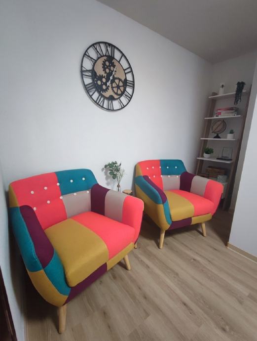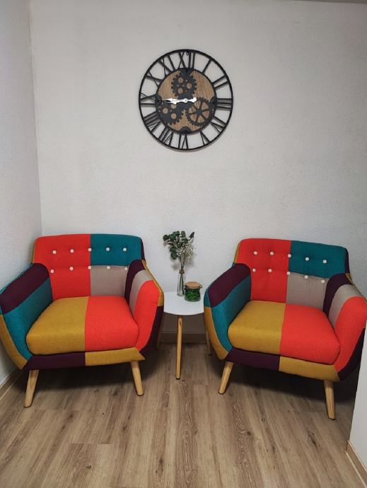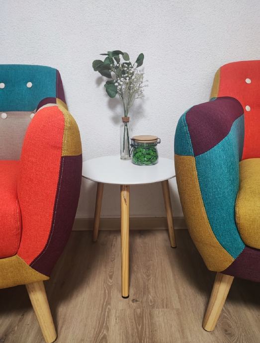 Dvije živopisne fotelje zanimljivog dizajna. Kupljene u Emmezeti prije 3 mjeseca. Nove i nekorištene, samo sastavljene i izložene.