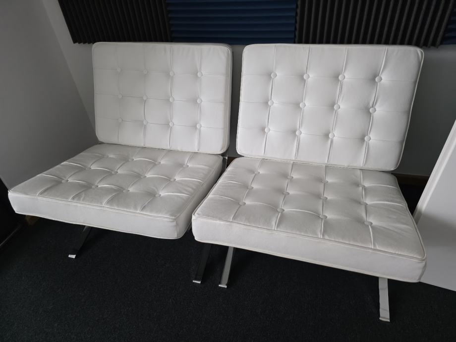 Fotelja, replika poznate fotelje "Barcelona". Bijela koža, kromirani čelik. Očuvano, malo korišteno. Ukupno 3 kom (cijena 280€ po komadu).