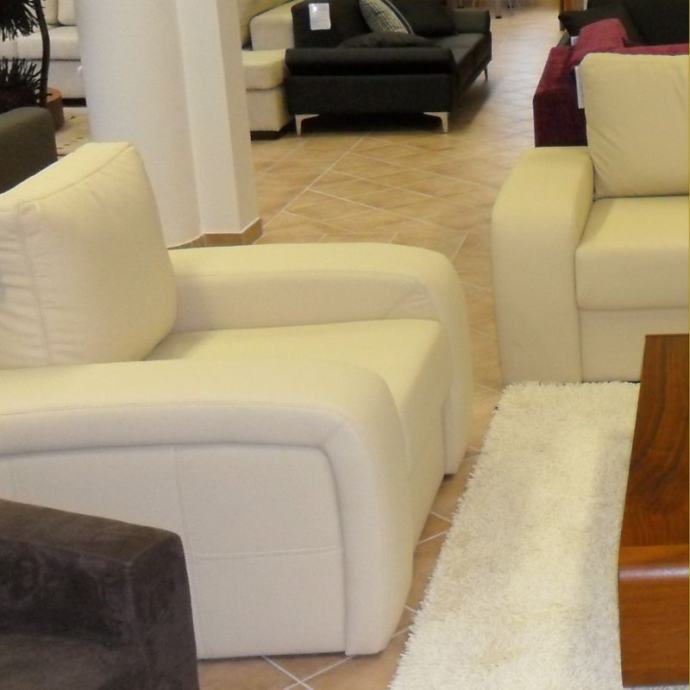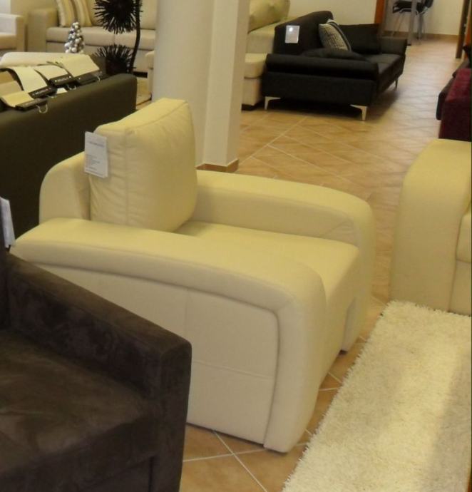 Nova nekorištena fotelja, u bež boji, materijal eko koža, konstrukcija masivno drvo, proizvođač Valde Sensi. Kupljena je kao dio garniture, ali je višak zbog ograničenog prostora. Umotana je u prozirnu zaštitnu foliju.