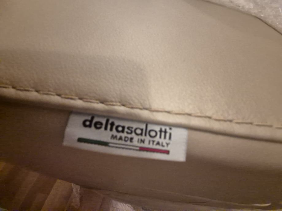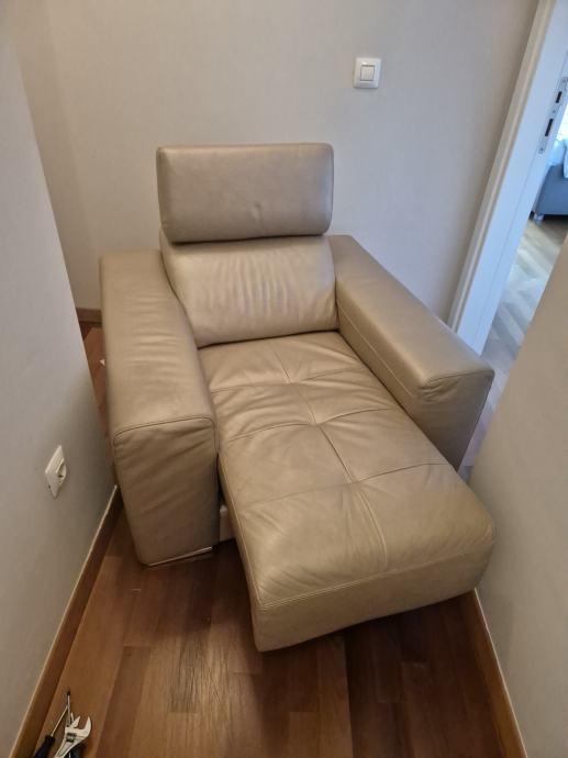 Kožna fotelja marke Deltasalotti u odličnom stanju, malo.korištena. Donje dimenzije postolja su 100 x 95 cm. izvlaci se i sjediste tako da se sjedi kao na malom kaucu i naslon za glavu se l podize.