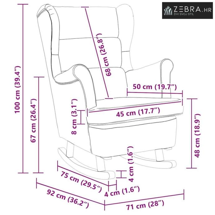 Zahvaljujući podstavi od pjene presvučenoj baršunom mekanim na dodir, možete uživati u najvećoj mogućoj udobnosti dok sjedite. Uz to, ova stolica za dnevni boravak poduprta je nogama za ljuljanje od masivnog drva kaučukovca koje osiguravaju dodatnu stabilnost.