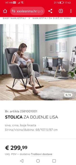 Potpuno nova, nekorištena, otpakirana fotelja za ljuljanje, idealna za dojenje i uspavljivanje bebe. Dobili na poklon, kupljena u Lesnini i višak nam je.