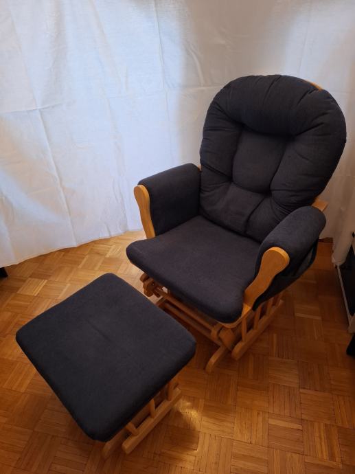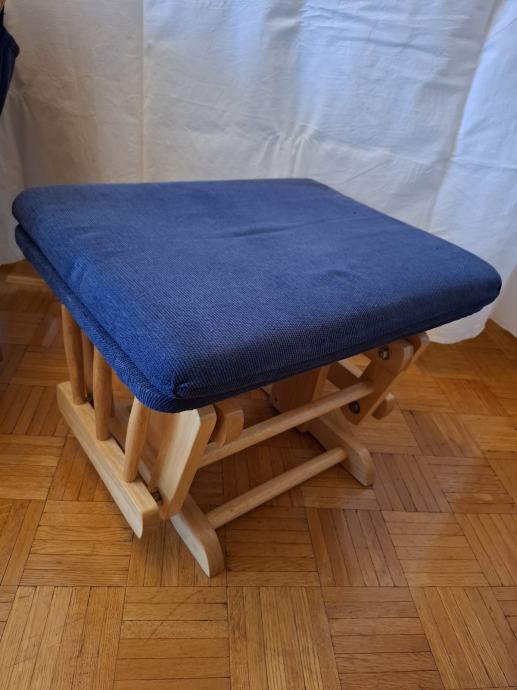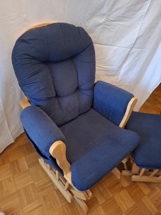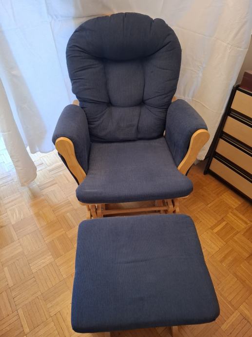 Prodajem fotelju za ljuljanje s tabureom, koji se također ljulja. Jastuci su plave boje i mogu se skinuti.