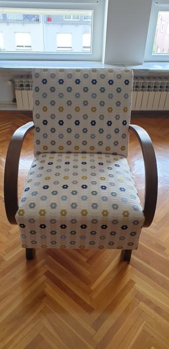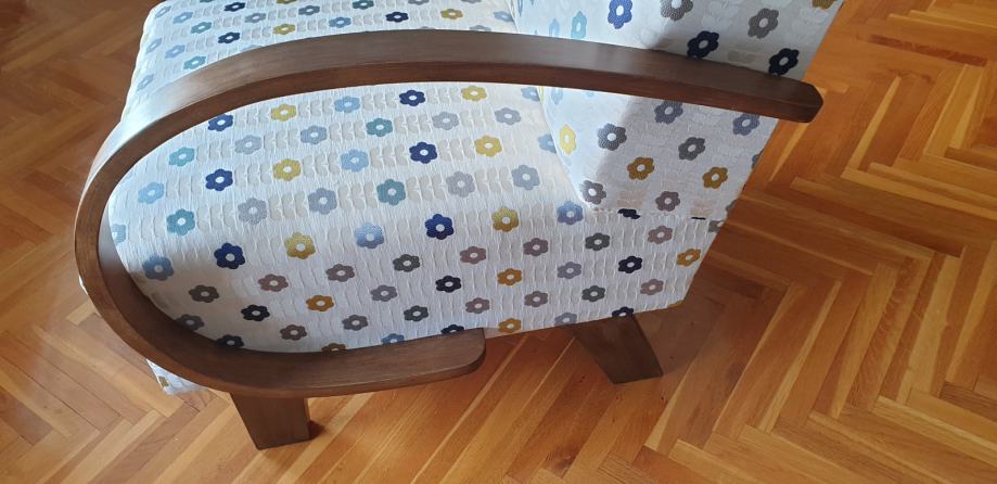 Potpuno obnovljena fotelja uz 60-tih. Promijenjeni federi, uređen drveni dio i novo tapecirana.