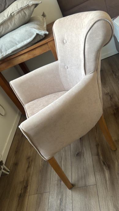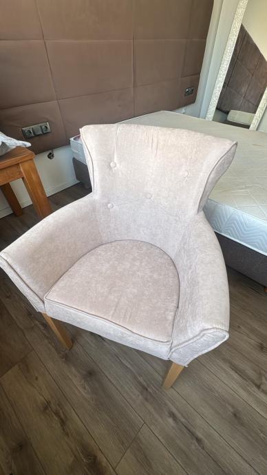Prodajem tapecirani fotelj u svijetloj bež/roza boji s elegantnim zakopčanim detaljima na naslonu. Naslon je visok i lagano zaobljen, što fotelji daje klasičan izgled. Noge su drvene, prirodne boje, a tkanina je mekana i ugodna na dodir s diskretnim uzorkom. Fotelj je kompaktan i dobro se uklapa u spavaću sobu ili dnevni boravak.