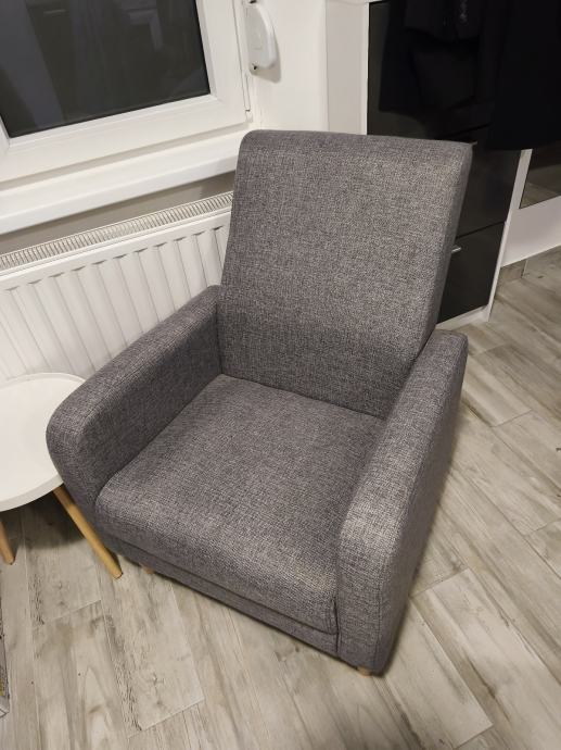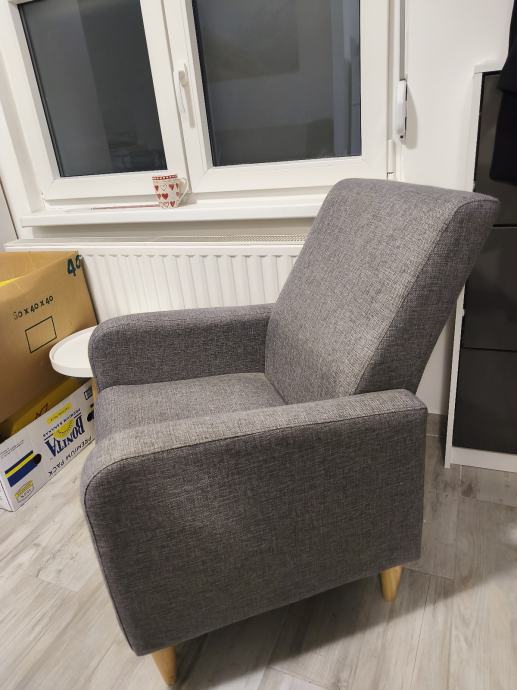 Prodajem fotelju u sivoj boji, presvučenu tkaninom. Ima čvrste naslone za ruke i visoki naslon za leđa, a stoji na drvenim nogicama.