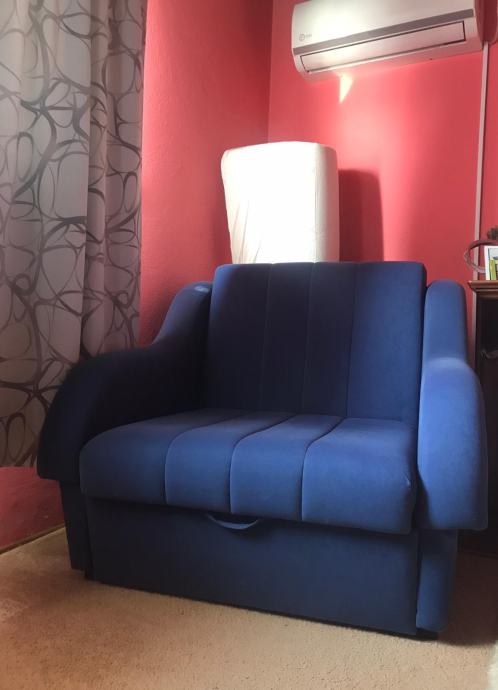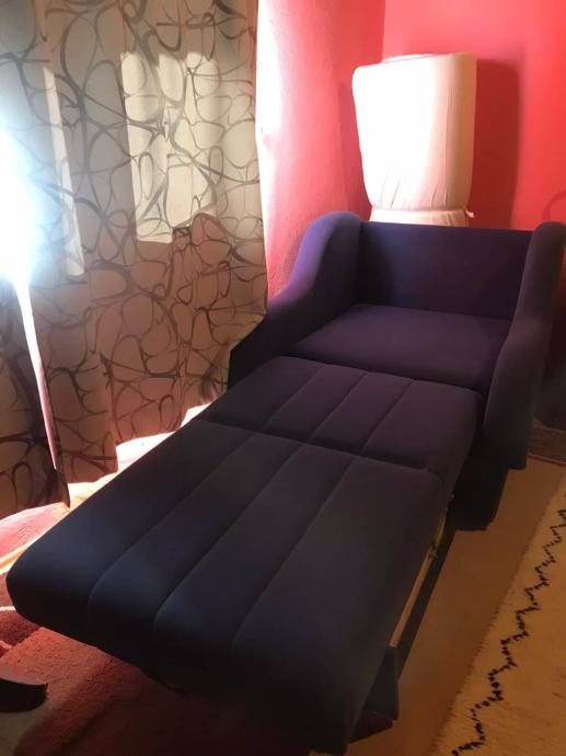Fotelja je stara 8 godina no vrlo je dobro očuvana, na razvlačenje je i pogodna je za svakodnevno spavanje. Ispod ima i ladicu koja može služiti kao spremište za posteljinu. Prodaje se zbog selidbe.