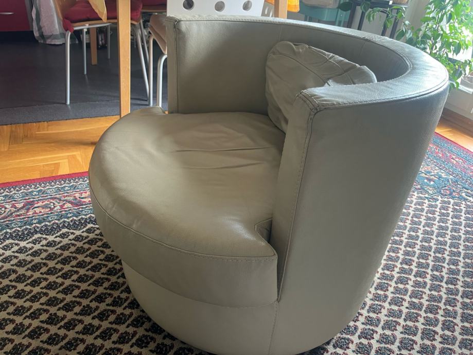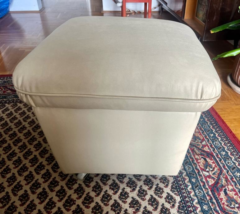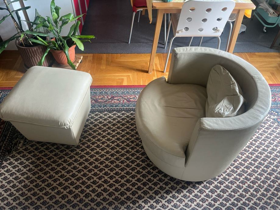 Kratki opis: fotelja i tabure od kože, domaća proizvodnja, odlično uščuvani, sjaj i neutralna boja, idealno se prodaje u kompletu. Tabure čak služi kao spremnik, kada se digne gornji dio.