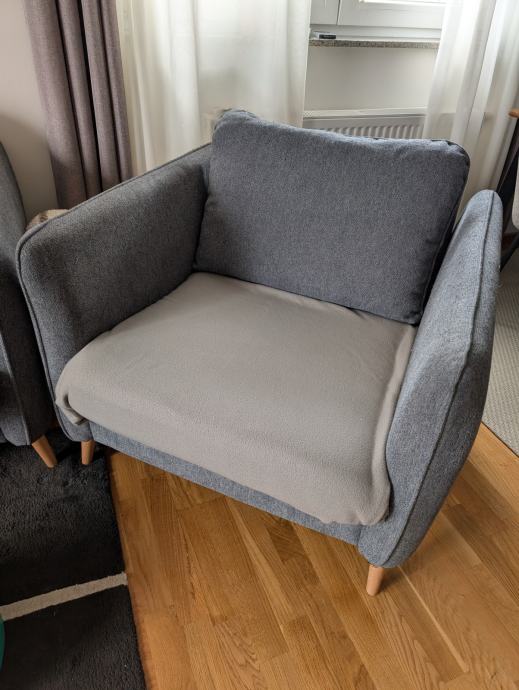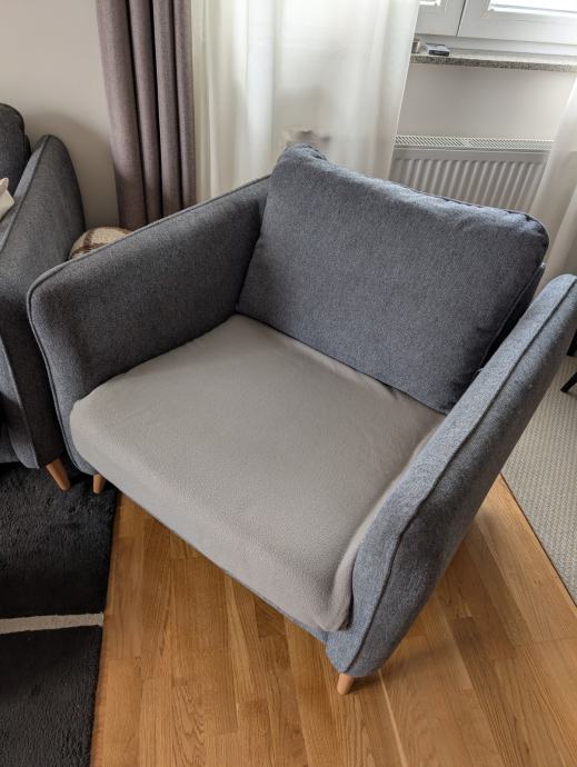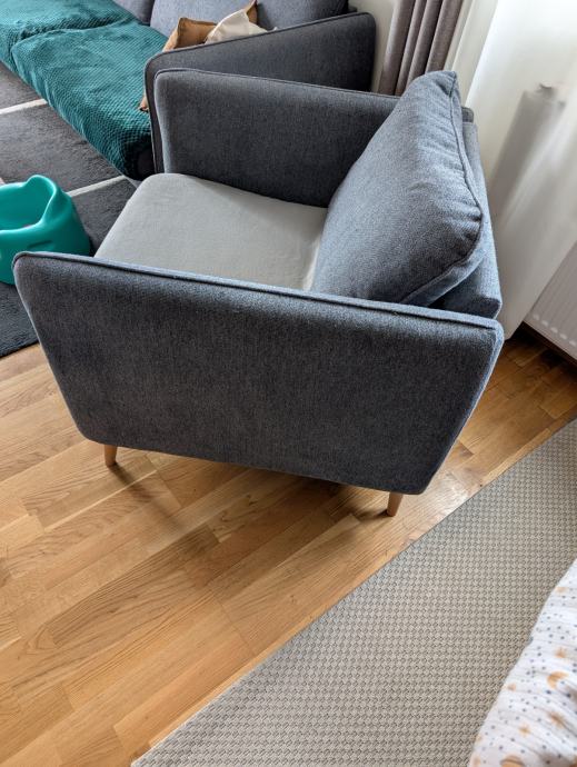 Prodajem fotelju antracit sive boje s drvenim nogicama, kupljenu 16.04.2024. Navlake za naslon i sjedište mogu se skinuti i perive su. Fotelja je korištena, ima manju ogrebotinu na naslonu, vidljivo na slikama. Dimenzije fotelje su 83 x 85 x 93 cm (visina x dubina x širina). Isključivo osobno preuzimanje.