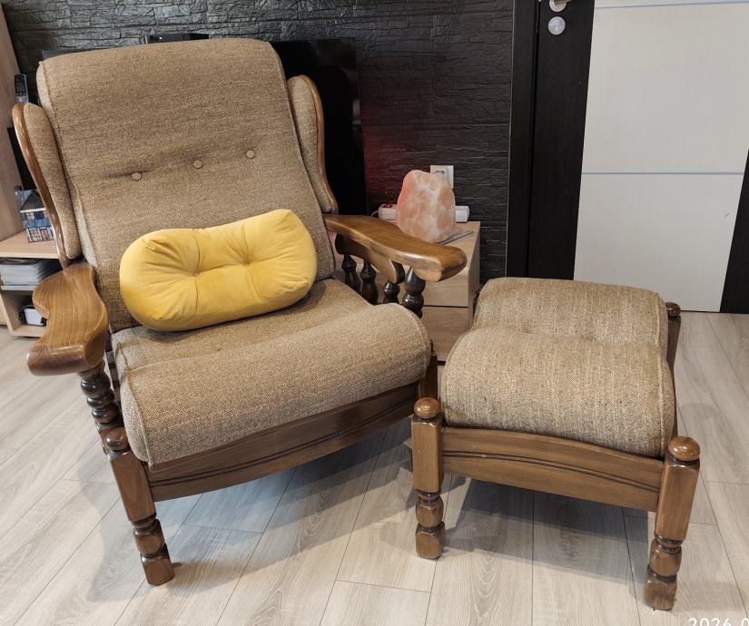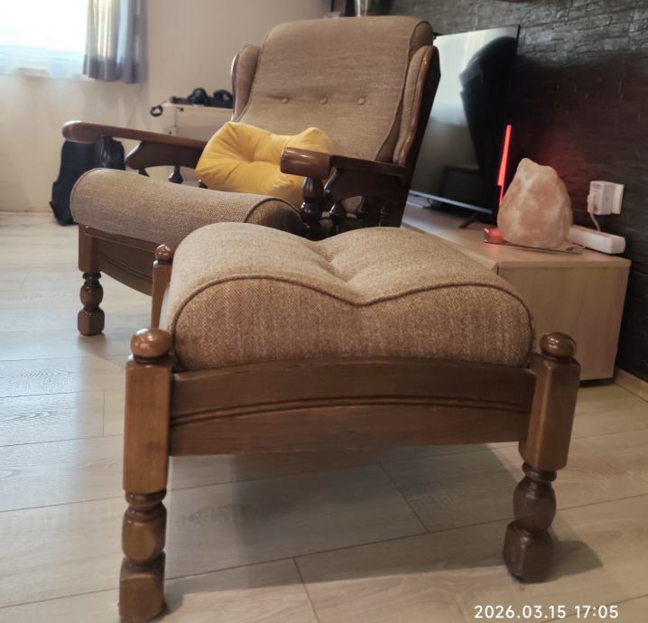 Prodajem drvenu vintage fotelju s pripadajućim tabureom. Stabilna, kvalitetna izrada i bez oštećenja – spremno za korištenje ili preuređenje po želji.