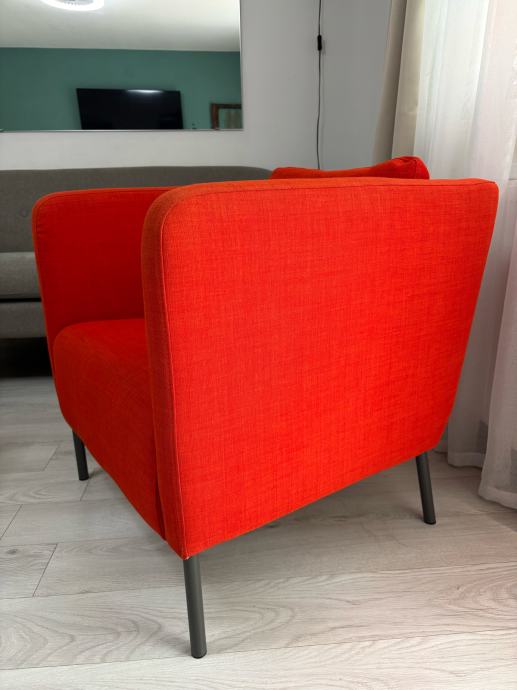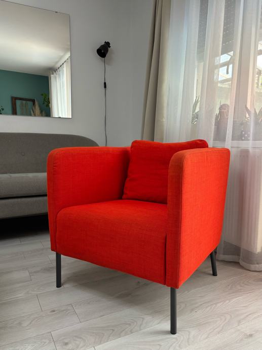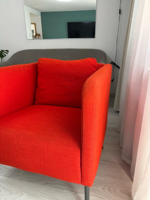 Prodajem Ikea Ekerö fotelju narančaste boje, korištena u dnevnom boravku, tragovi korištenja u obliku blage promjene boje na naslonjaču za ruke i jastuku za sjedenje. Fotelja je kemijski oprana, čista i odmah dostupna za preuzimanje na adresi u centru Osijeka.