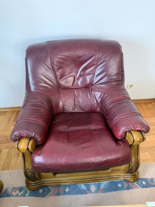 Kožna fotelja je u dobrom stanju, uz uobičajene znakove korištenja. Na pojedinim mjestima vidljivo je blago ispucala koža, što je prikazano na fotografijama.