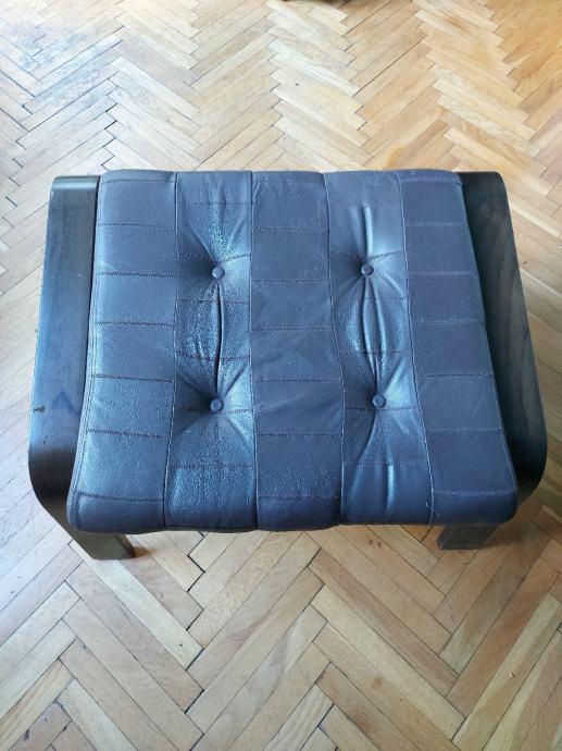 Vrlo udobna, potpuno očuvana kožna fotelja s tabureom za noge bez ikakvih oštećenja. Koža i tamno drvo + stolić sa staklom i odjeljkom za novine ili knjige. Svjetiljka gratis!!!