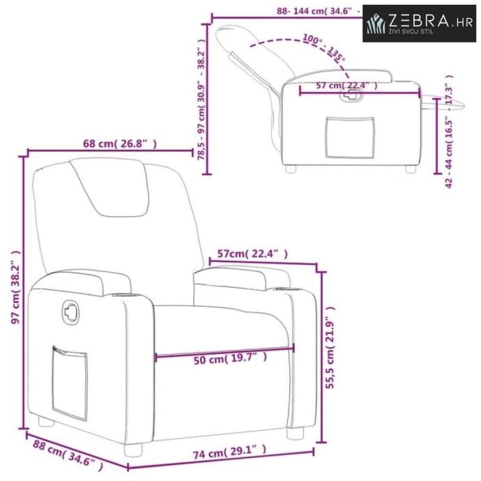 Funkcija ručnog naginjanja: Ovaj naslonjač ima ručku na desnoj strani. Možete ručno podesiti oslonac za noge i naslon bilo u koji položaj prema vašoj udobnosti jednostavnim povlačenjem ručke. Ta značajka omogućuje maksimalni nagib od 135 stupnjeva. Osim toga, naslon se može brzo vratiti na prvobitno mjesto jednostavnim povlačenjem ručke.