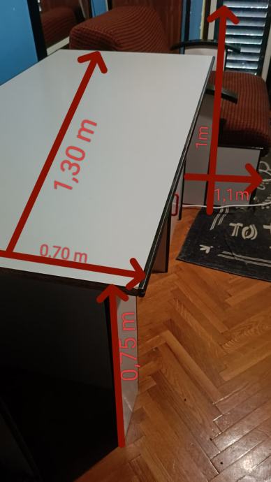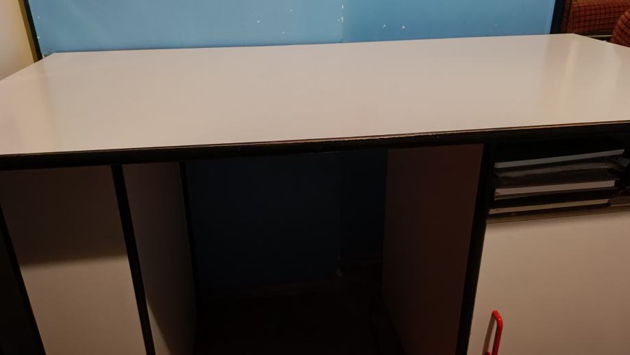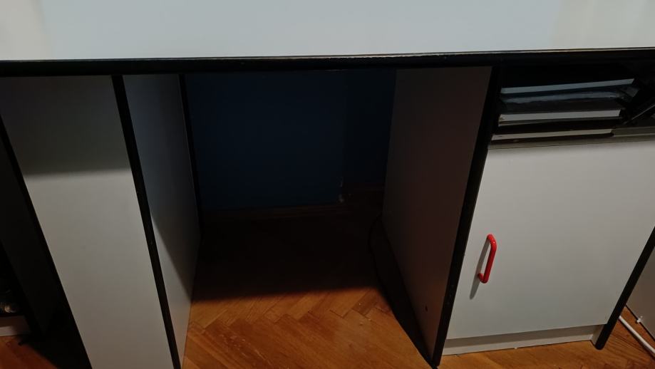 Poklanja se radni stol i fotelja na razvlačenje. Staro oko 40 g., funkcionalno, bez većih oštećenja. Stol (s malim ogrebotinama, izguljenom bojom na rubovima) s malim ugrađenim ormarićem, potpuno stabilan. Dimenzije d130*š70*v75 cm