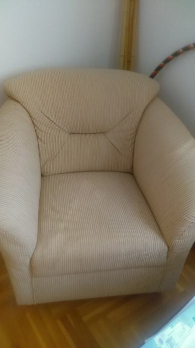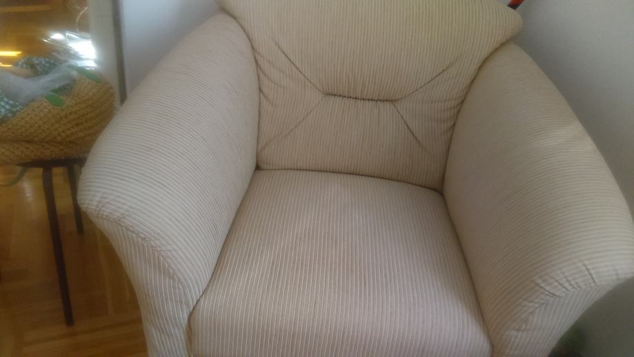Fotelja je rucne izrade tkanina rebrasta boja bijele kave,na nogicama. Š gore 85 cm, dole kod sjedista 95 cm,dubina sjedista 55 cm,visina naslona 55 cm.