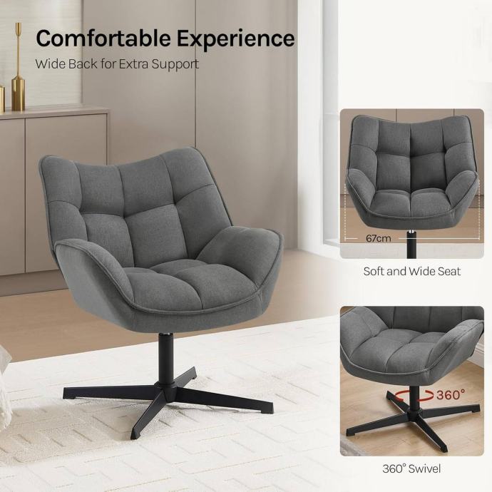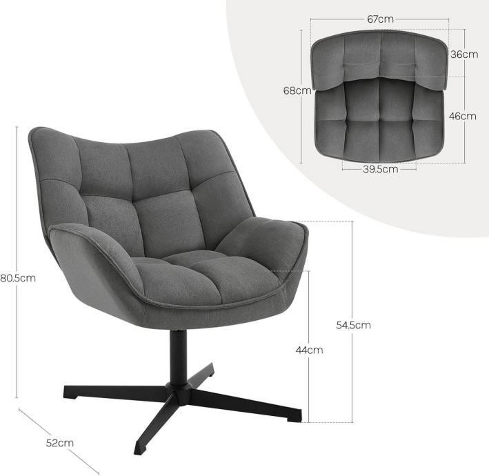 Naslonjač je dizajniran prema ergonomskim principima – naslon i nasloni za ruke savršeno prate liniju tijela, dok blago nagnuto sjedalo omogućuje prirodno opuštanje. Široko sjedalo (67 cm) pruža obilje prostora, a mogućnost 360° okretanja omogućuje lako kretanje i uživanje u različitim položajima, bilo da se nalazite u dnevnoj sobi, spavaćoj sobi, na balkonu ili u čekaonici.
