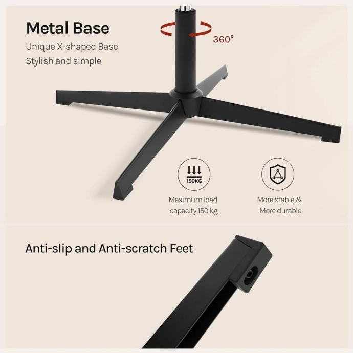 Čvrst metalni okvir u obliku slova X osigurava stabilnost, dugotrajnost i nosivost do 150 kg. Protuklizne noge dodatno učvršćuju konstrukciju i štite pod od oštećenja. Montaža je vrlo jednostavna zahvaljujući jasnim ilustriranim uputama, označenim dijelovima i priloženim alatom, tako da je naslonjač spreman za korištenje u svega nekoliko minuta.