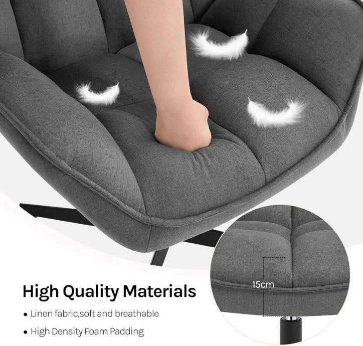 Udoban i elegantan, ovaj relaks naslonjač nudi vrhunsku potporu i opuštanje zahvaljujući izdašnom punjenju i kvalitetnim materijalima. Sjedalo i naslon debljine 15 cm ispunjeni su visokoelastičnom pjenom koja pruža mekoću, ali i čvrstu potporu tijekom dugotrajnog sjedenja. Presvlaka od lanene tkanine dodatno povećava udobnost jer je prozračna, ugodna na dodir i sprječava osjećaj zagušljivosti.