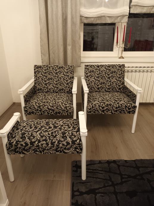Prodajem dvije retro fotelje i tabure, tapecirano, u dobrom stanju. Osobno preuzimanje.